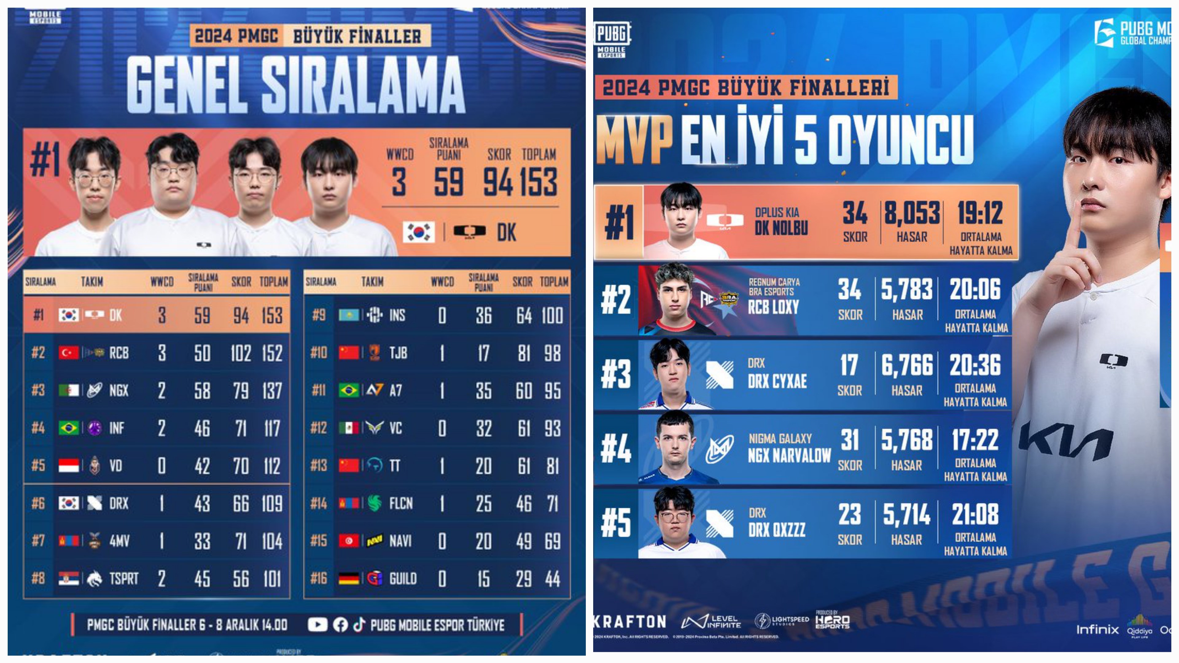 DPLUS KIA oyuncusu Nolbu, 34 skor ve 8,053 hasar ile finallerin MVP ödülünü aldı. Listede temsilcimiz RCB Esports’un oyuncusu Loxy’de etkileyici performansı ile 2. sırada kendisine yer buldu. Regnum Carya Bra eSpor ekibi ikinci olarak 200 bin dolarlık ödülün de sahibi oldu.