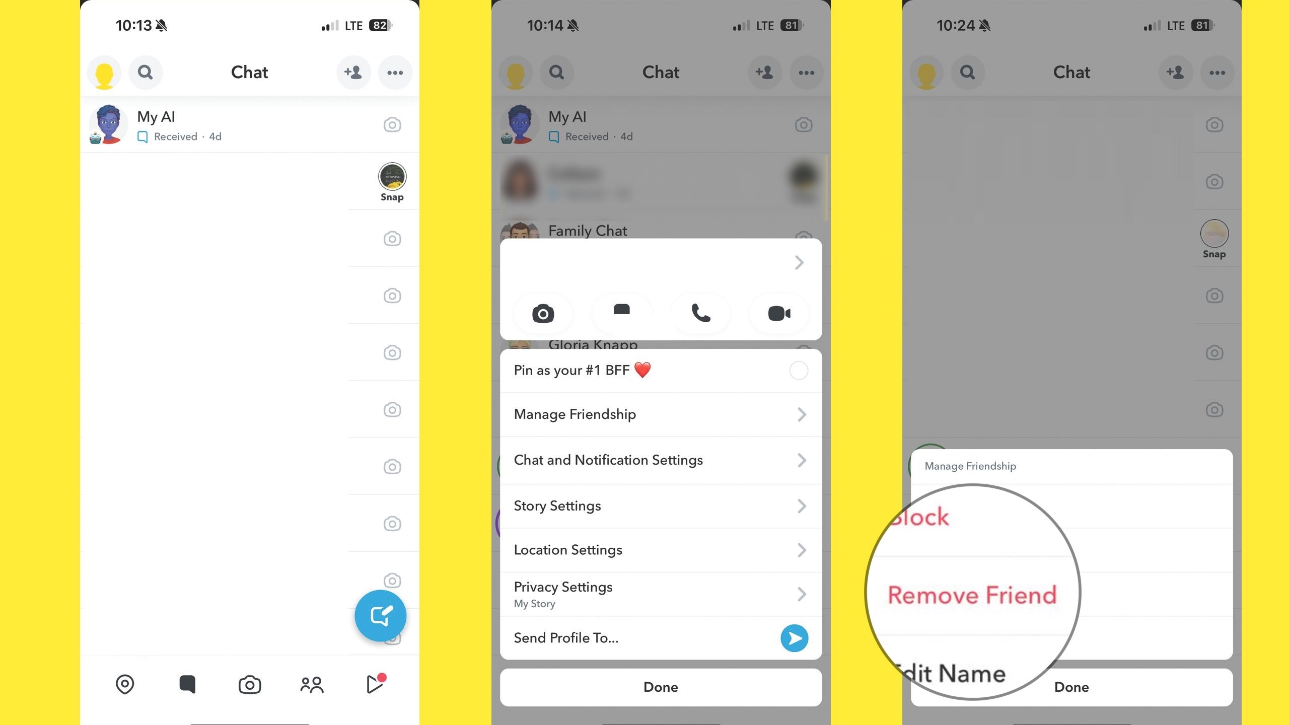 Snapchat’te arkadaş listesinden çıkarmanın bir yolu daha var. Sağa kaydırarak sohbet ekranına gelin. Bir arkadaşınızın profil simgesine dokunun. En üstteki üç çizgiye dokunun ve Arkadaşlığı Yönet üzerine dokunun. Son olarak Arkadaşı Kaldır seçeneğini seçin. Snapchat’te arkadaşlıktan çıkardığınız biri hikayeler ekranında da gözükmez.