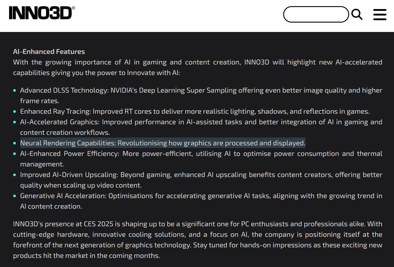 Inno3D’nin CES 2025 için hazırladığı basın bülteni açık olmak gerekirse oldukça belirsiz ve çeşitli yorumlamalara açık. Ancak firmanın yapay zekaya yaptığı vurgular Nvidia’nın bir şeyler hazırladığına işaret ediyor. Inno3D’nin açıklamasına göre, yeni nesil DLSS teknolojisi (Deep Learning Super Sampling), daha yüksek FPS ve üstün görsel kalite sunacak. Bu tanımlama muhtemelen DLSS 4’e bir atıf.