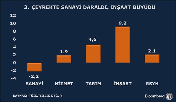 3. çeyrekte yıllık bazda asanayi yüzde 2,2 daralırken, hizmetler yüzde 1,9, tarım yüzde 4,6 ve inşaat yüzde 9,2 büyüdü.