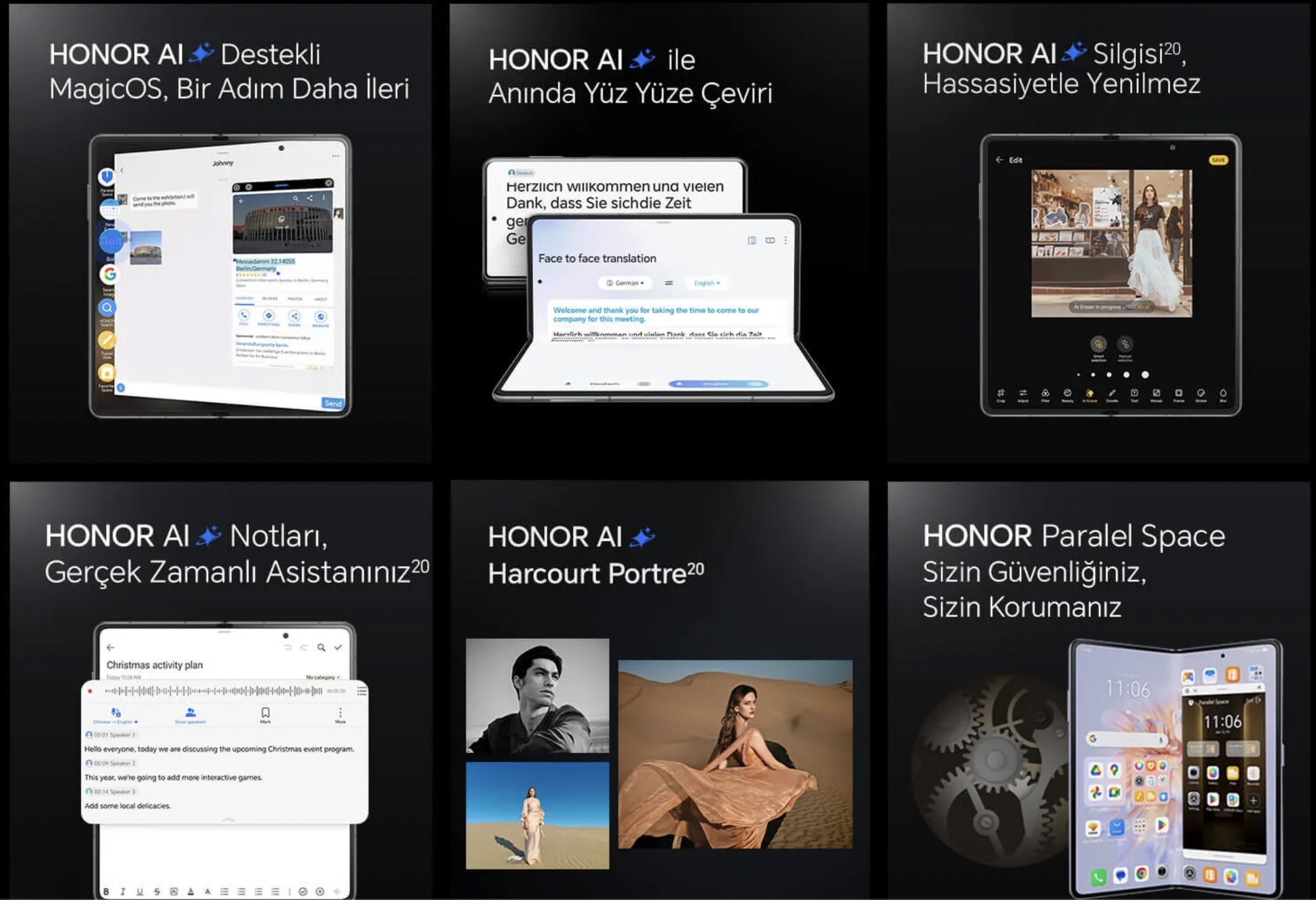 HONOR Magic V3, dil bariyerlerini kaldıran gerçek zamanlı bir çeviri özelliği sunar. Kullanıcılar, cihaz katlanmış veya açık durumdayken bu özelliği kullanabilir. Özellik, konuşmaları anında çevirerek yabancı dilde iletişimde büyük kolaylık sağlar. Örnek kullanım senaryoları: