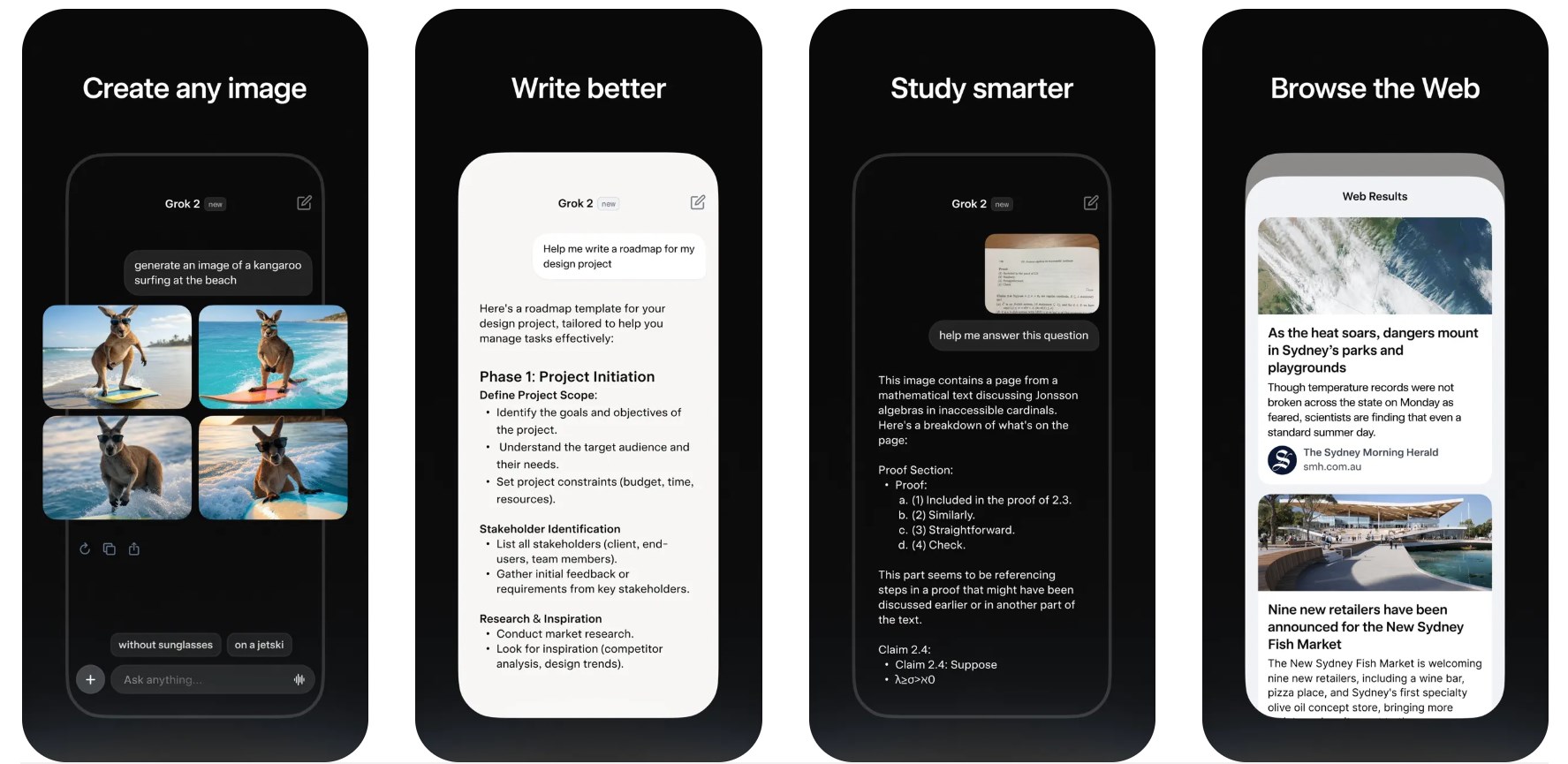 Grok uygulaması gerçek zamanlı veri erişimi sağlayarak web ve X platformundan bilgi alabiliyor. Uygulama, metinleri yeniden yazma, uzun paragrafları özetleme, soru-cevap yapma gibi üretken yapay zeka özelliklerinin yanı sıra metinden görüntü oluşturma yeteneğine de sahip.