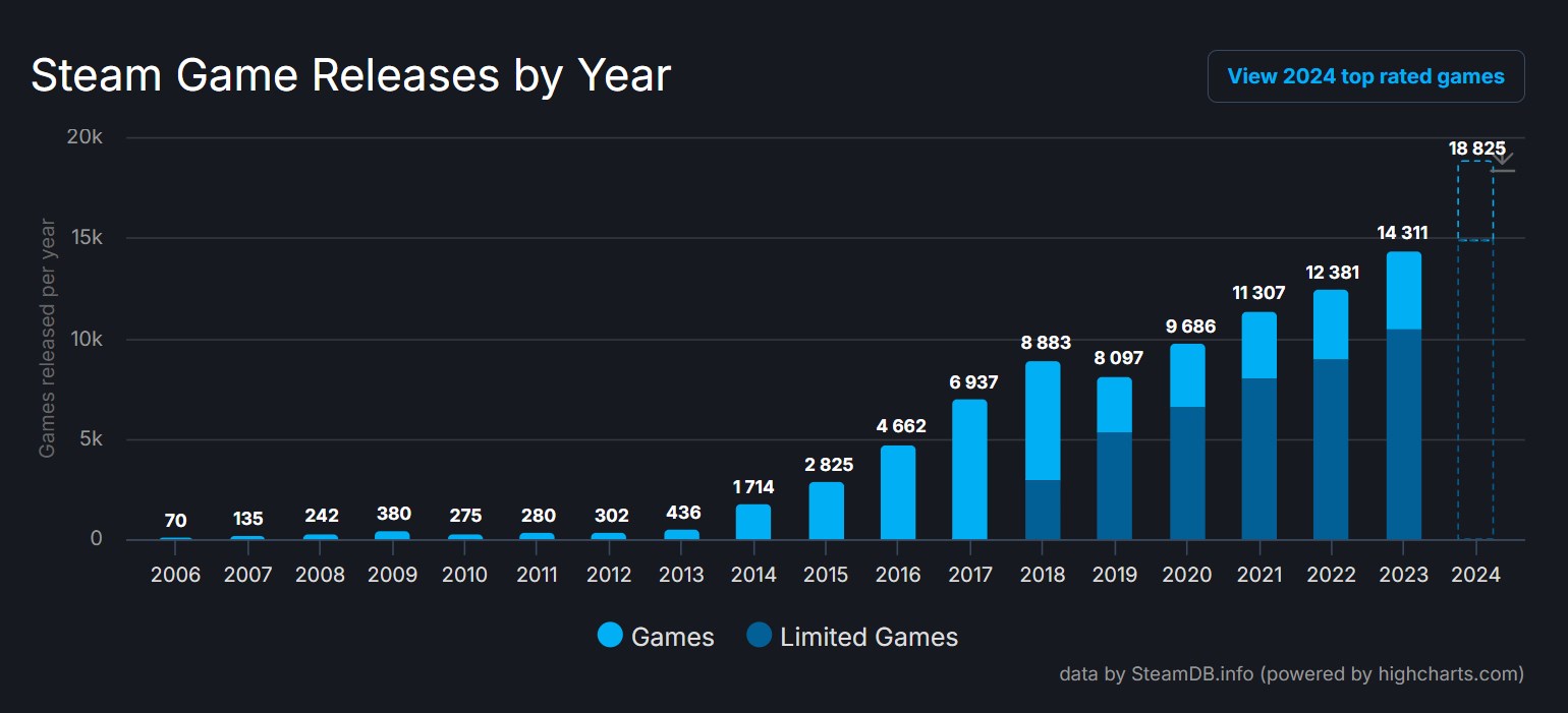 Dijital oyun dağıtım platformu Steam, 2024’te 18.825 yeni oyun yayınlarak geçen yılki 14.311’lik rekorunu kırdı. 2024 yılı aynı zamanda 2019’dan beri en fazla oyun artışının gerçekleştiği yıl oldu.