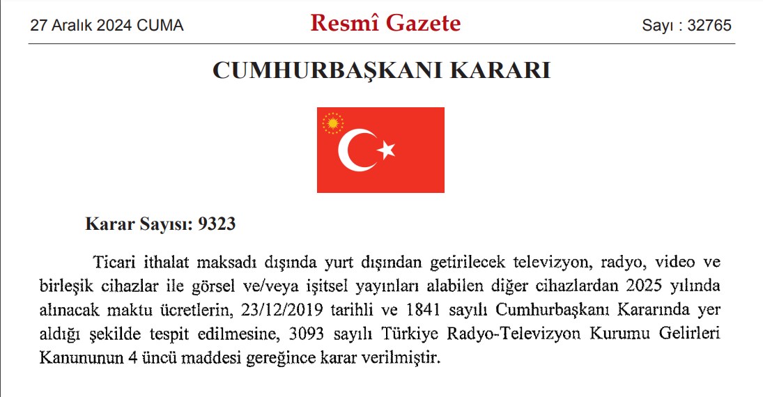 Resmi Gazete’nin bugünkü sayısında yayımlanan Cumhurbaşkanı Kararı ile ticari ithalat maksadı dışında yurt dışından getirilecek televizyon, radyo, video ve bileşik cihazlar ile görsel ve/veya işitsel yayınları alabilen diğer cihazlardan 2025 yılında alınacak bandrol ücretleri belli oldu.