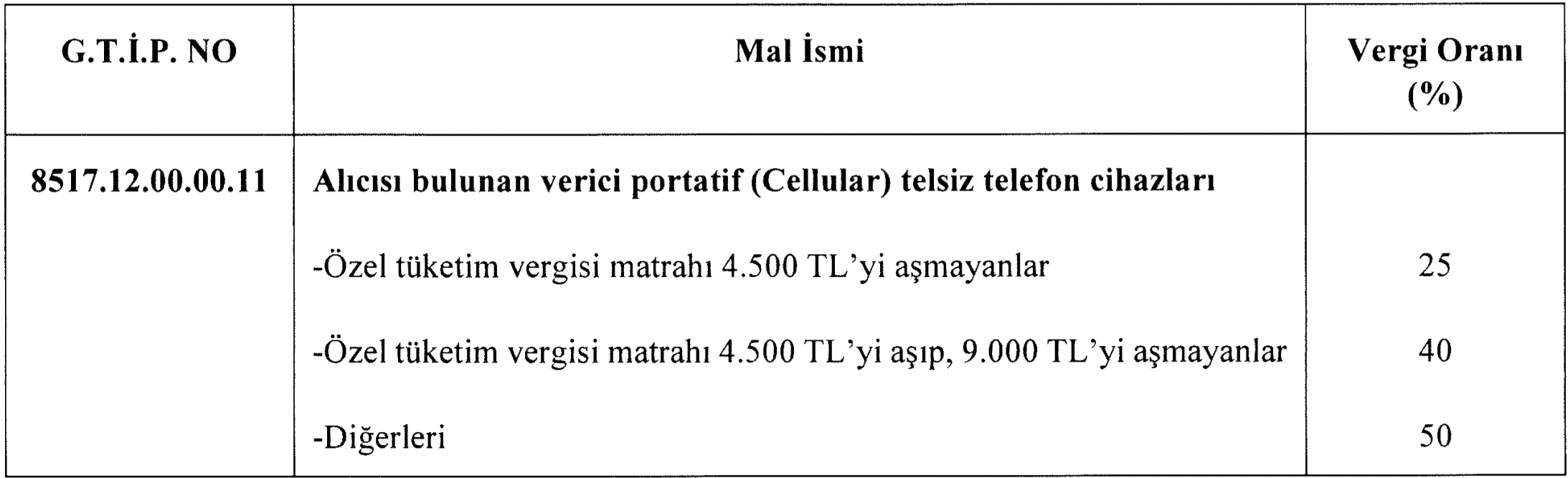 Telefonlardaki ÖTV oranı, telefonun ÖTV’siz fiyatına göre yüzde 25, yüzde 40 ve yüzde 50 şeklinde artan oranlarla tahsil ediliyor. Daha önce ÖTV’siz fiyatı 1.500 TL ve 3.000 TL olarak uygulanan matrahlar 4.500 TL ve 9.000 TL’ye yükseltildi.