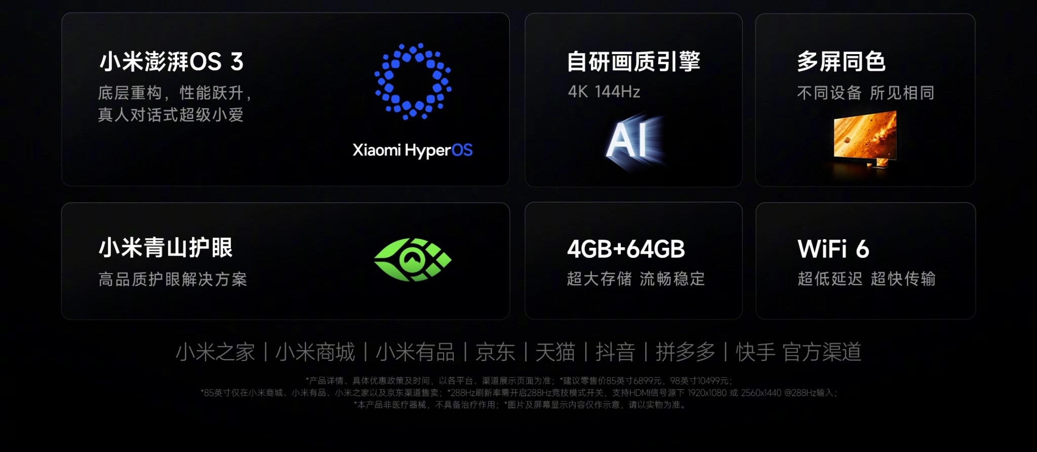 Televizyonda dört çekirdekli MediaTek MT9655 işlemci var. Buna 4 GB RAM ve 64 GB dahili depolama eşlik ediyor. Yazılım tarafı ise HyperOS 3‘e emanet edilmiş. Bağlantı seçenekleri olarak Wi-Fi 6, Bluetooth 5.2, iki adet HDMI 2.1 ve iki adet USB 3.0 portu kullanıcılara sunuluyor.