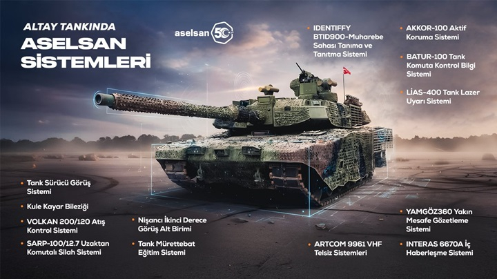 BMC ile imzalanan ALTAY Seri Üretim Projesi Alt Sistemler Sözleşmesi kapsamında 251 tank için kritik görev donanımlarını sağlayan ASELSAN, tanklarda yüksek ateş gücü, beka kabiliyeti ve gelişmiş koruma teknolojilerinin imzasını taşıyor. modern muharebe şartlarına uygun geliştirilen ve atışlı testlerde üstün performans gösteren sistemler arasında VOLKAN‑II Tank Atış Kontrol Sistemi, uzaktan komutalı silah sistemi, Tank Komuta Kontrol Bilgi Sistemi, iç haberleşme, Tank Lazer Uyarı Sistemi, tank sürücü görüş sistemi, Aktif Koruma Sistemi (AKKOR), Muharebe Sahası Tanıma ve Tanıtma Sistemi, ÖRÜMCEK YAMGÖZ yakın mesafe gözetleme, nişancı ikinci derece görüş alt birimi, tank mürettebat eğitim sistemi (TMES) ile telsiz ve kayar bilezik sistemleri yer alıyor. Özellikle özgün olarak geliştirilen AKKOR, radar tabanlı algılama yeteneğiyle tankı 360 derece koruma altına alarak beka kabiliyetini üst düzeye taşıyor ve TMES’in gömülü simülatörü mürettebata gerçek kullanıcı arayüzleri üzerinden sanal eğitim imkanı sunarak görev öncesi hazırlığı artırıyor. ASELSAN’ın milli periskop sistemleri ise ALTAY’ın “gözleri” olarak mürettebata geniş görüş açısı, yüksek doğrulukta tespit ve etkin gözetleme sağlarken, şirketi bir tankın tüm görev donanımlarını kendi bünyesinde geliştirebilen nadir firmalardan biri haline getirip hem yeni üretimde hem de modernizasyonda uluslararası rekabet kabiliyetine taşıyor.