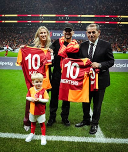 Galatasarayımızın unutulmaz 10 numaralı oyuncusu Dries Mertens ile eşi Kat ve minik oğulları Ciro’ya, Galatasaray Spor Kulübü Başkanı Dursun Aydın Özbek tarafından karşılaşma öncesinde kendilerine özel hazırlanan formalar hediye edildi.