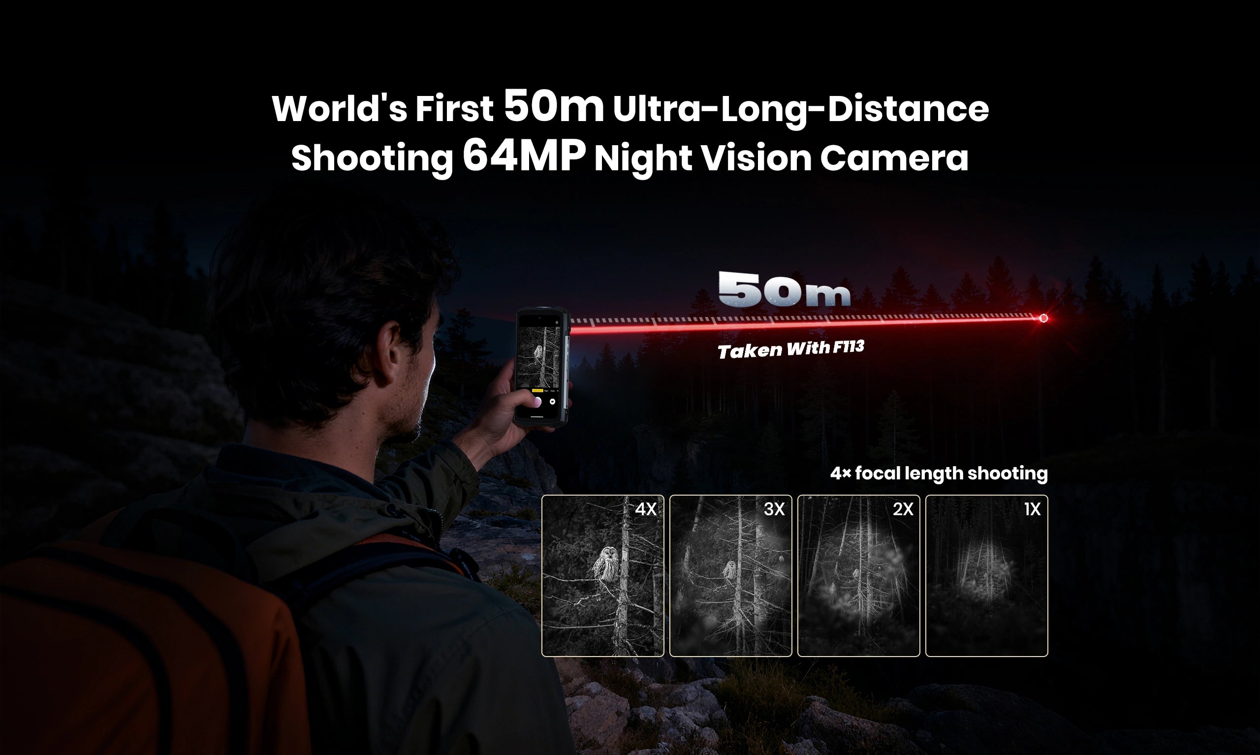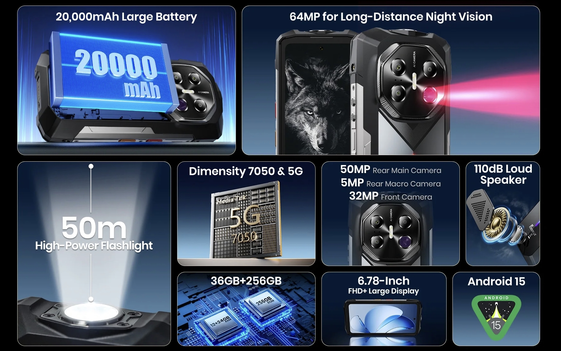 Fossibot F113 akıllı telefon, karanlıkta 50 metreye kadar görüş sağlayan 64 MP kızılötesi kamerasıyla öne çıkıyor. Fossibot, Dimensity 7050 işlemci, 12 GB RAM, 120 Hz ekran ve 20.000 mAh bataryayla geliyor.