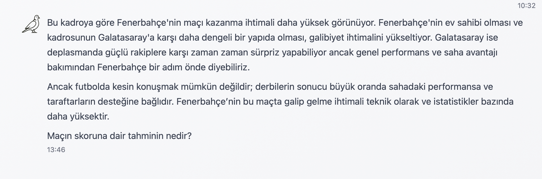 Yerli yapay zeka Kumru, etik gerekçelerle maçın skoru hakkında tahmin yapmaktan çekiniyor. Ancak biraz ısrar üzerine yaptığı tahminde Fenerbahçe’nin ev sahibi olması ve daha dengeli kadroyla çıkacak olması nedeniyle derbiyi Fenerbahçe’nin kazanacağını öngörüyor.