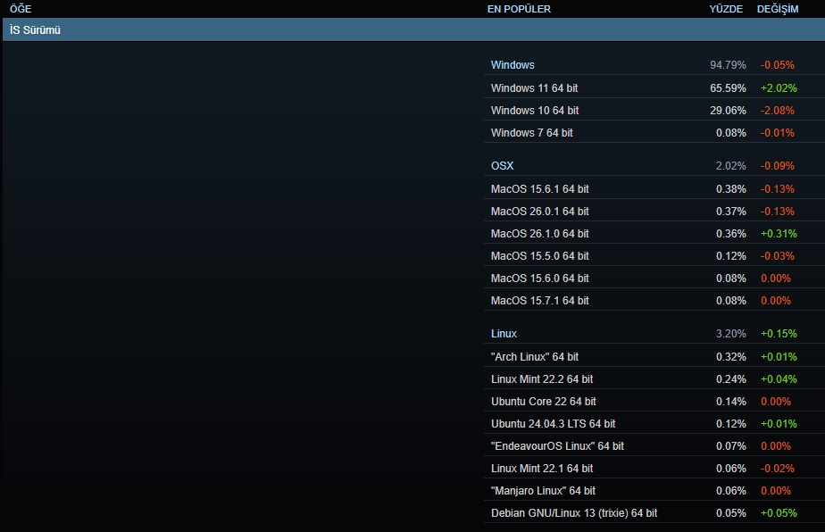 Steam’in aylık donanım anketi verileri, Linux tarafında yükselişin ivme kazandığını bir kez daha doğruladı. Ekim ayında ilk kez yüzde 3 eşiğini aşan Linux kullanımı, kasım ayında yüzde 3,2’ye ulaşarak üst üste ikinci ay rekor seviyeye çıktı. Bu oran halen Windows tarafının yüzde 94,79’luk ağırlığıyla kıyaslandığında çok küçük görünse de Linux için belirgin bir ivmenin oluştuğunu ortaya koyuyor.