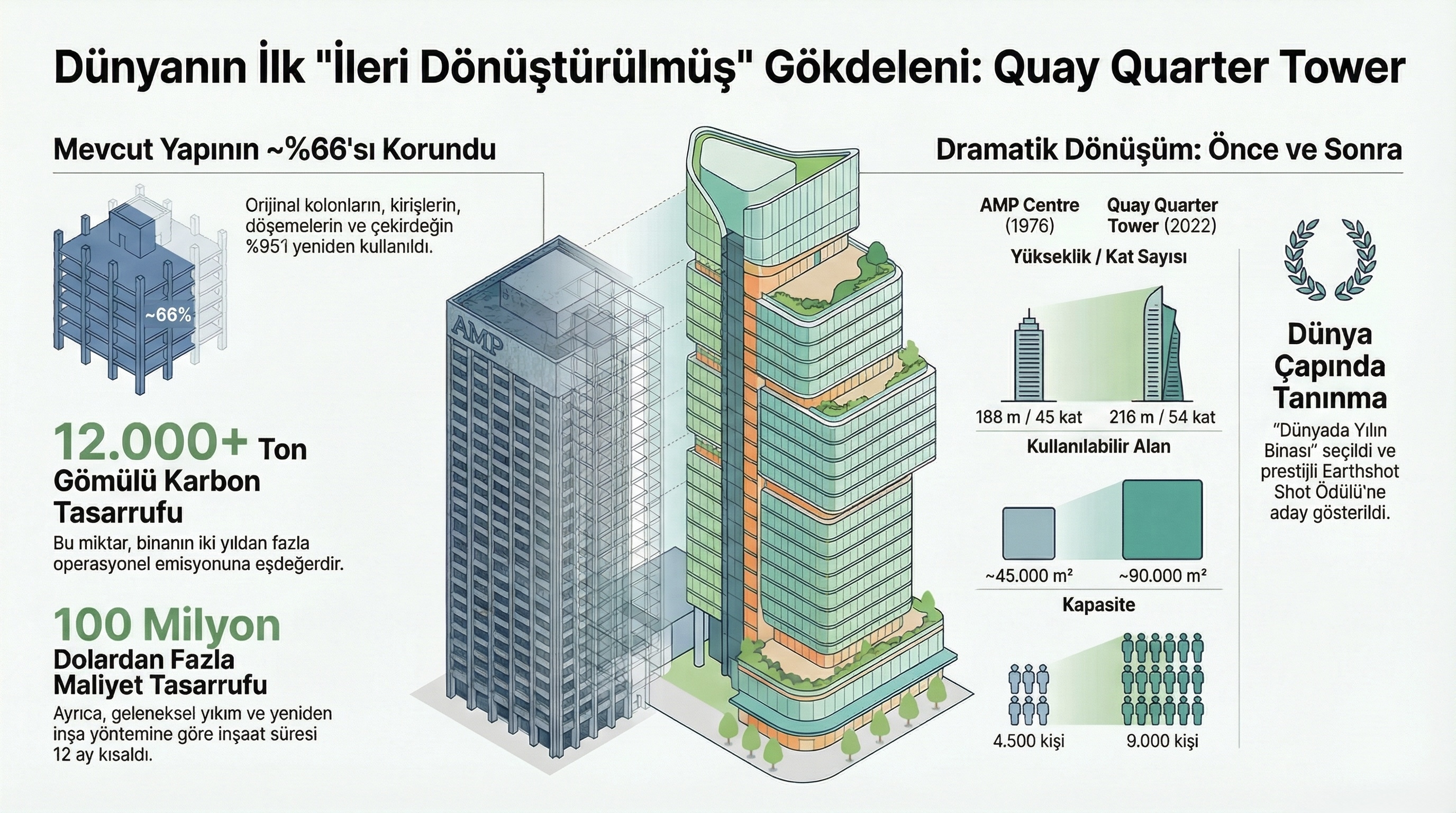 Döneminin en iyi yapılarından biri olan AMP Center, aradan geçen yıllar içinde ihtiyaçlara cevap veremez hale gelmişti. Binada çalışan 4.500 kişinin daha modern bir komplekse geçmesi için yıkım seçeneği masadaydı. Ancak proje ekibi, yapıyı yıkmak yerine geri dönüştürerek 9.000 kişinin çalışabileceği çağdaş bir komplekse dönüştürdü. Bu süreçte binanın kolon ve kirişleri dahil eski yapının %65’i, çekirdeğin ise %98’i korundu.