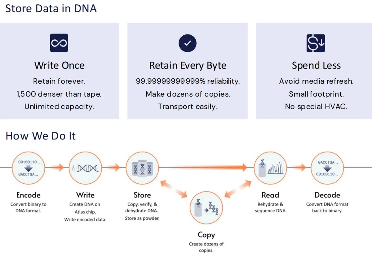 DNA tabanlı depolama teknolojileri üzerine çalışan bir girişim olan Atlas Data Storage ilk ticari ürününü tanıttı. Şirket, dünyanın ilk ölçeklenebilir DNA veri depolama çözümü olarak nitelendirdiği Atlas Eon 100 adlı hizmetini piyasaya sürdü.