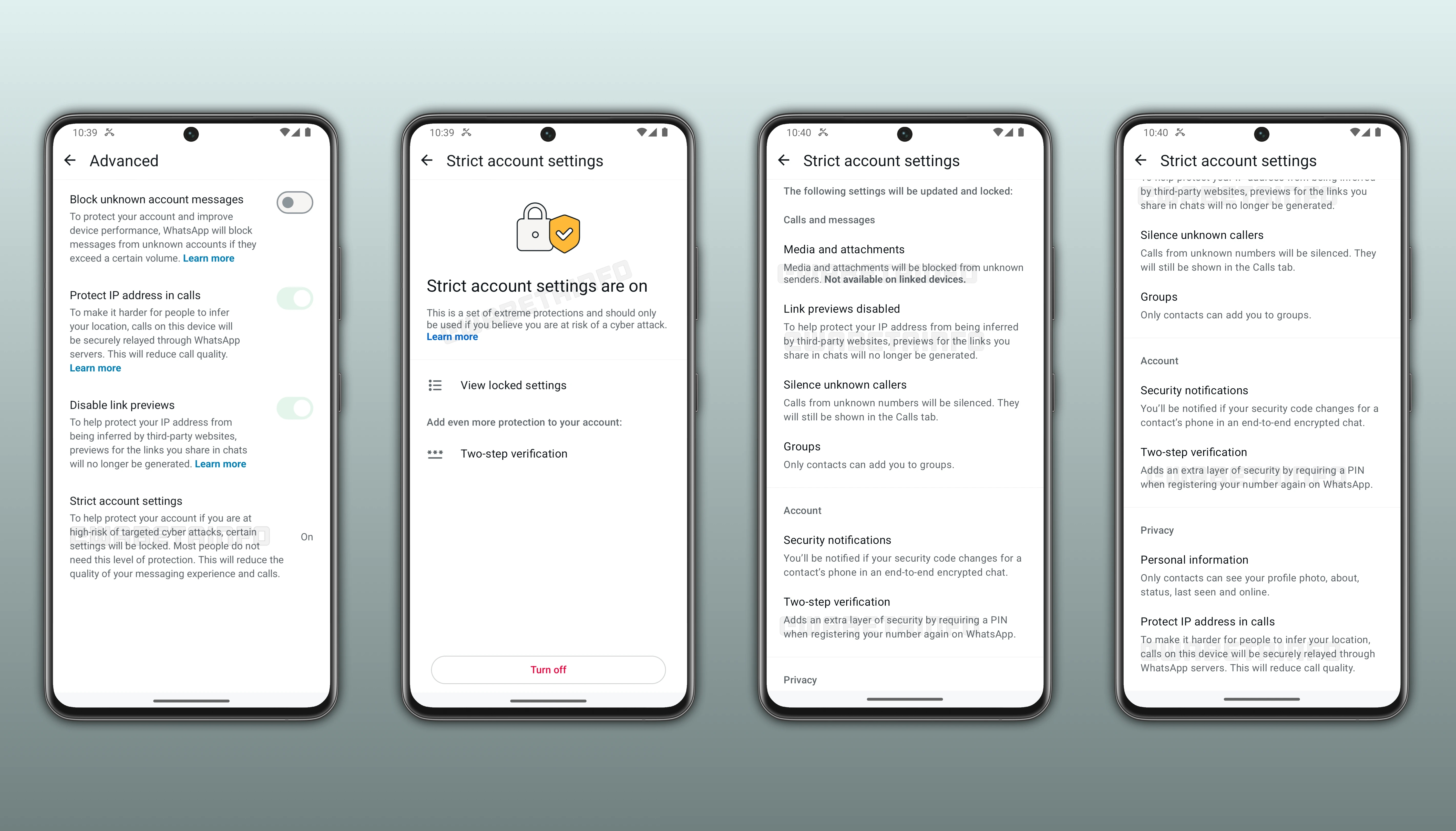Artık WhatsApp hesabınızı korumak için her ayarı elle değiştirmenize gerek kalmayacak. Sıkı hesap güvenliği ayarları etkinleştirildiğinde, bilinmeyen kişilerden gelen medyaları engelleme, bilinmeyen aramaları sessize alma, grup davetlerini yalnızca kişilerle sınırlama gibi ayarları WhatsApp, sizin yerinize otomatik olarak yapacak.