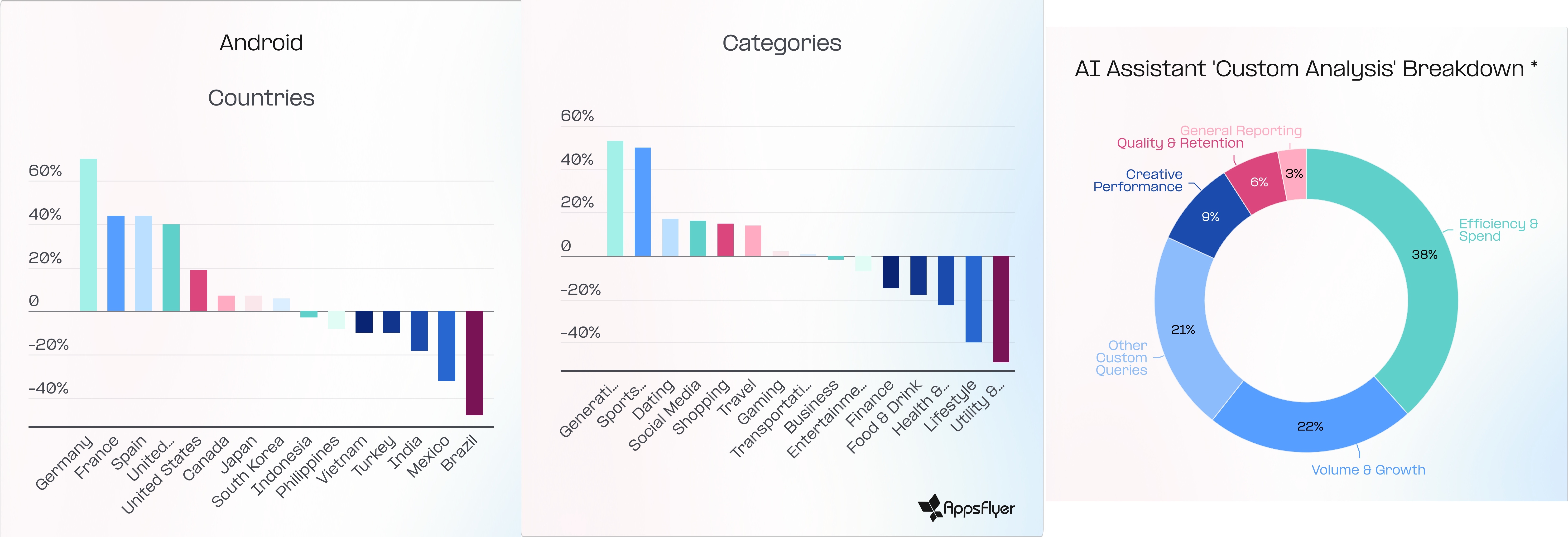 AppsFlyer’ın raporuna göre, üretken yapay zeka uygulamalarının indirilme oranları bir yıl içinde %16 artış gösterirken, iOS ve Android platformlarında kategori bazlı reklam harcamaları toplamda 824 milyon dolara ulaştı. Ayrıca üretken yapay zeka uygulamalarında, yaratıcılık, üretkenlik ve yapay zeka asistanı rolleri artış gösterdi ve yılın en hızlı büyüyen kategorileri arasında Android’de 1. sırada ve iOS’ta 4. sırada yer aldı.