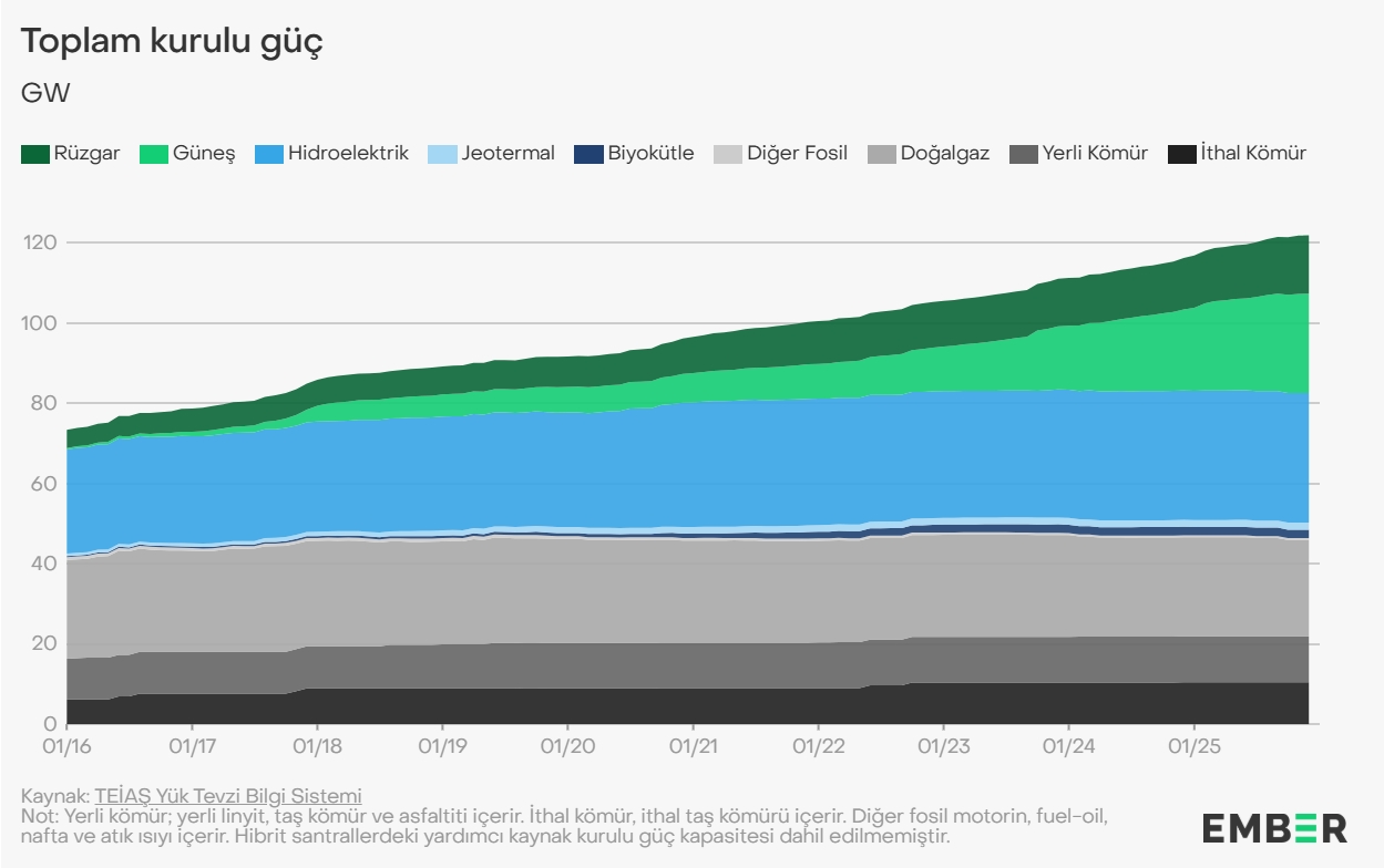 Türkiye’nin toplam elektrik kurulu gücü yaklaşık 121.4 GW olarak gerçekleşti. Bu toplam içinde güneş, rüzgâr, hidroelektrik, jeotermal ve biyokütle gibi yenilenebilir ve temiz enerji kaynaklarının toplam kurulu gücü 75.5 GW’a ulaştı. Bu tabloya göre Türkiye’deki toplam kurulu gücün yaklaşık yüzde 62,2’si yenilenebilir ve temiz enerji kaynaklarından oluşuyor. Türkiye, 2035’te 120 GW yenilenebilir enerji kurulu güce ulaşmayı hedefliyor.