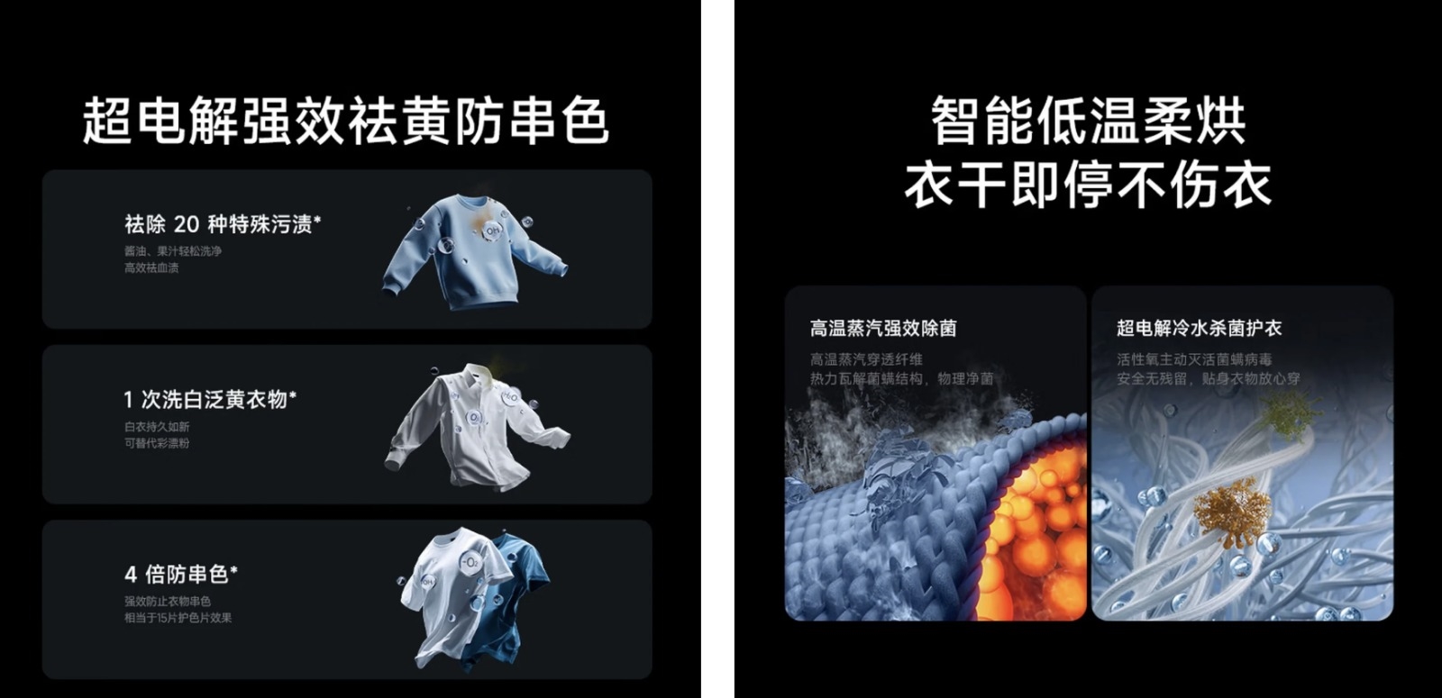 Xiaomi Mijia Pro 12 kg çamaşır makinesi, markanın kendi geliştirdiği Süper Elektroliz Teknolojisi ile donatılmış durumda. Bu teknoloji, suyun elektroliz edilmesiyle elde edilen aktif oksijen sayesinde lekeleri parçalayarak temizlik sağlıyor. Kimyasal katkı maddelerine ihtiyaç duymadan çalışan sistem, hem çevre dostu bir yapı sunuyor hem de kumaşların yıpranmasını azaltıyor. Yağ, kan, meyve suyu ve soya sosu gibi günlük hayatta sık karşılaşılan zorlu lekelerin etkili şekilde temizlenmesi bu teknolojinin öne çıkan avantajları arasında yer alıyor.