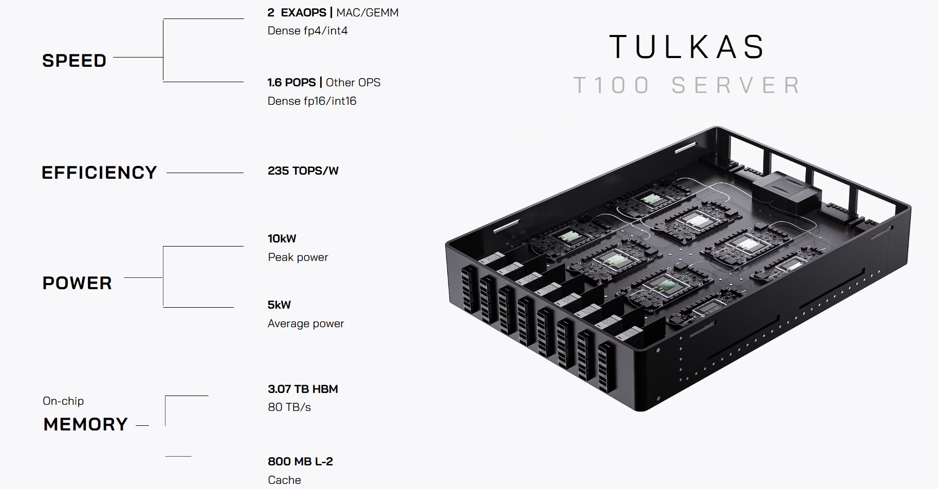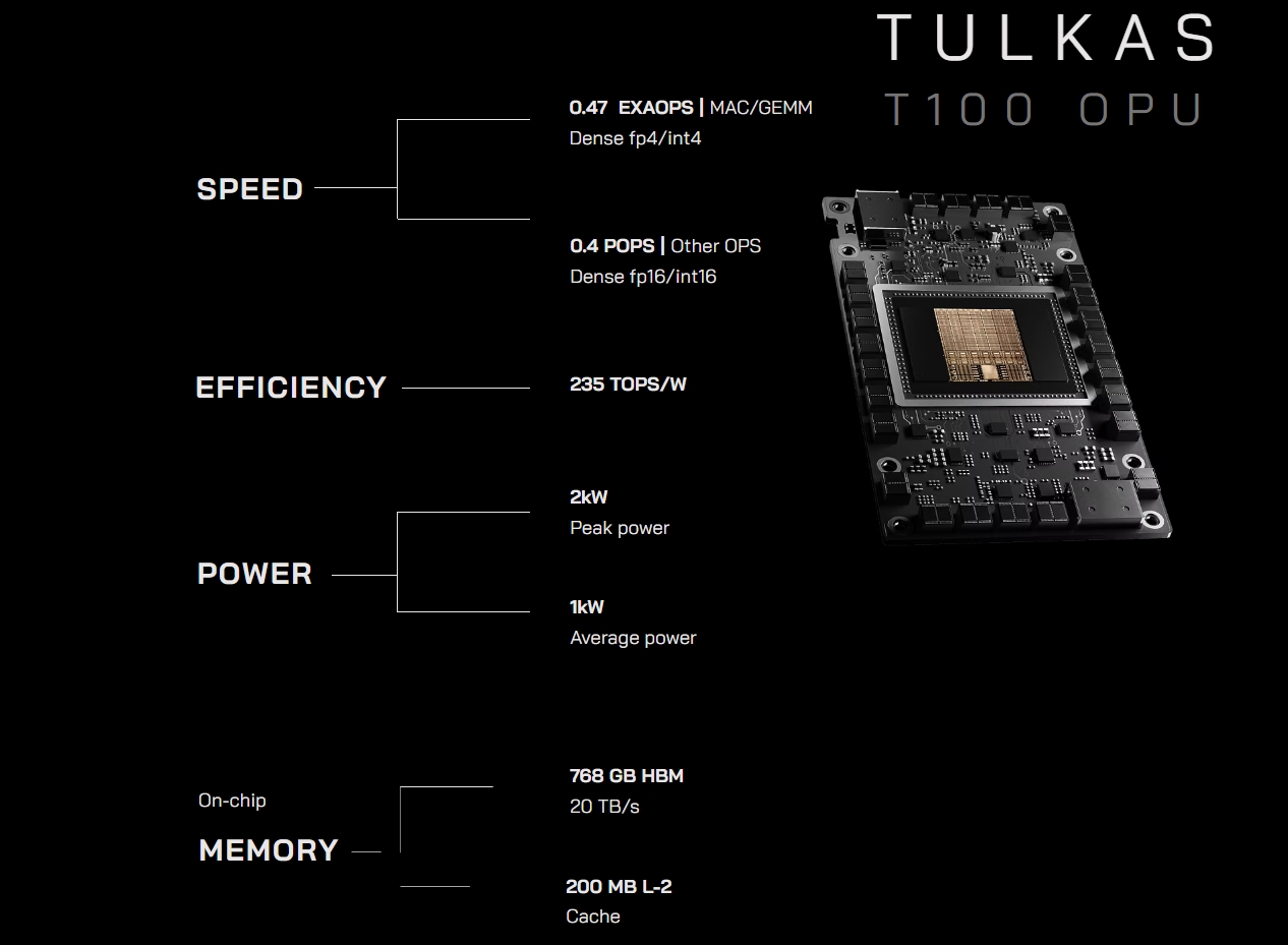 Şirketin Tulkas T100 adını verdiği ilk OPU’su, 56 GHz gibi son derece yüksek bir saat hızında çalışıyor. Yüksek saat hızı ve büyük matris yapısı birleştiğinde kağıt üzerinde zayıf görünen donanımın Nvidia’nın güçlü yapay zeka GPU’larını geride bırakabildiği belirtiliyor. Şirket, çipinin saniyede 235 Peta Operasyon (POPS) zirve performansı sağlayabileceğini ve 675 watt güç tüketeceğini belirtiyor. Buna karşılık, B200 çipi 1.000 watt güçte 9 POPS performans sağlayabiliyor.
