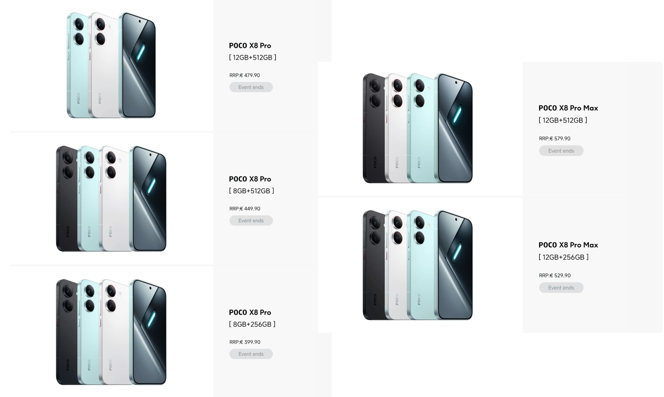 Poco, X8 serisinin lansmanını henüz resmi olarak doğrulamamış olsa da, markaya ait bir promosyon sayfasında Poco X8 Pro ve Poco X8 Pro Max modelleri listelendi. Yayında olan sayfa, cihazların tasarım görsellerinin yanı sıra bellek seçeneklerini ve Avrupa fiyatlarını da doğrulamış oldu.