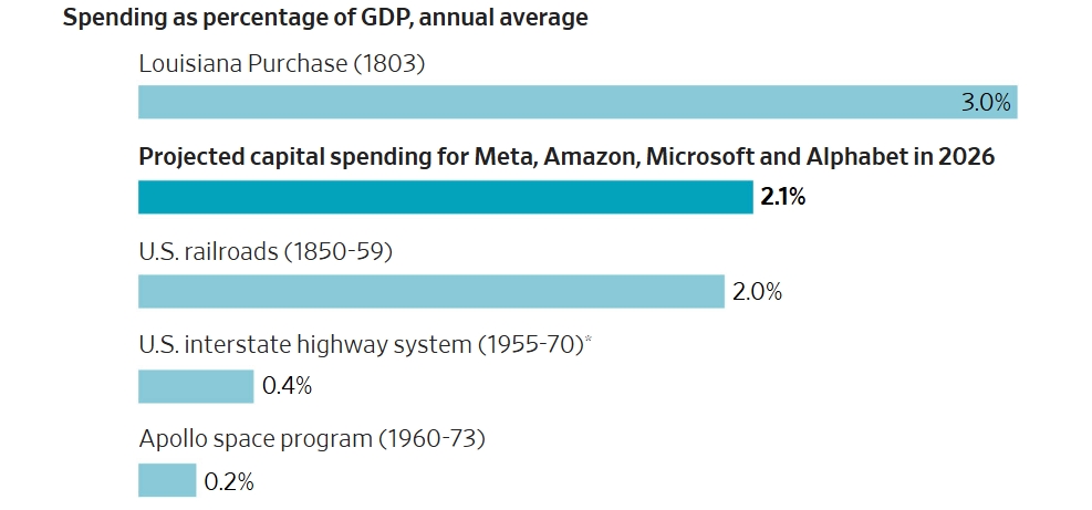 Uzmanlara göre bu ölçekte bir sermaye harcaması ABD tarihinde yalnızca 1803’te gerçekleştirilen ve ülkenin yüzölçümünü iki katına çıkaran Louisiana Satın Alımı ile kıyaslanabiliyor. Yapay zeka yatırımları, gayrisafi yurt içi hasılaya oranlandığında, tarihsel olarak “olağanüstü” kabul edilen tüm diğer büyük projeleri geride bırakmış durumda.