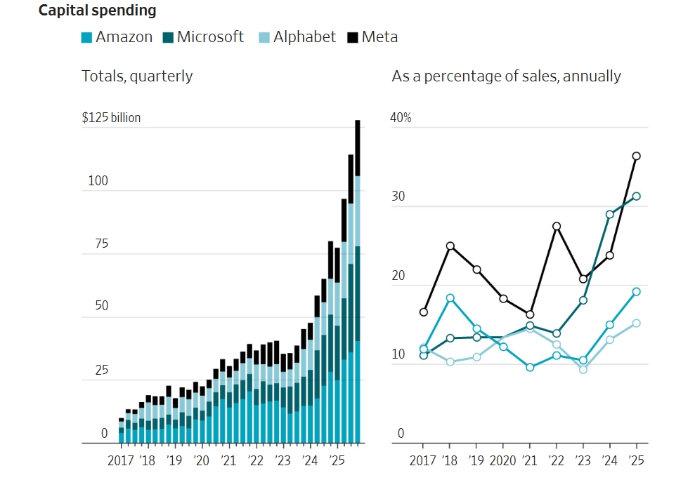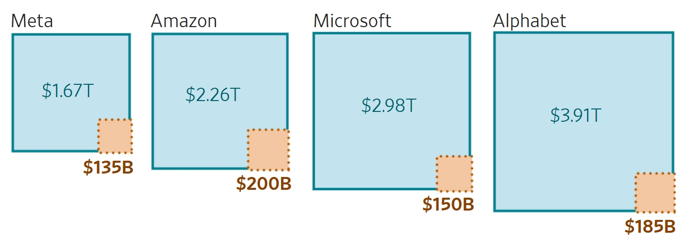 2026 için öngörülen rakamlar, teknoloji devlerinin ölçeğini net biçimde ortaya koyuyor. Amazon’un yaklaşık 2,26 trilyon dolarlık piyasa değerine karşılık 200 milyar dolarlık, Microsoft’un 2,98 trilyon dolara karşılık 150 milyar dolarlık, Alphabet’in 3,91 trilyon dolara karşılık 185 milyar dolarlık ve Meta’nın 1,67 trilyon dolara karşılık 135 milyar dolarlık sermaye harcaması planı bulunuyor.