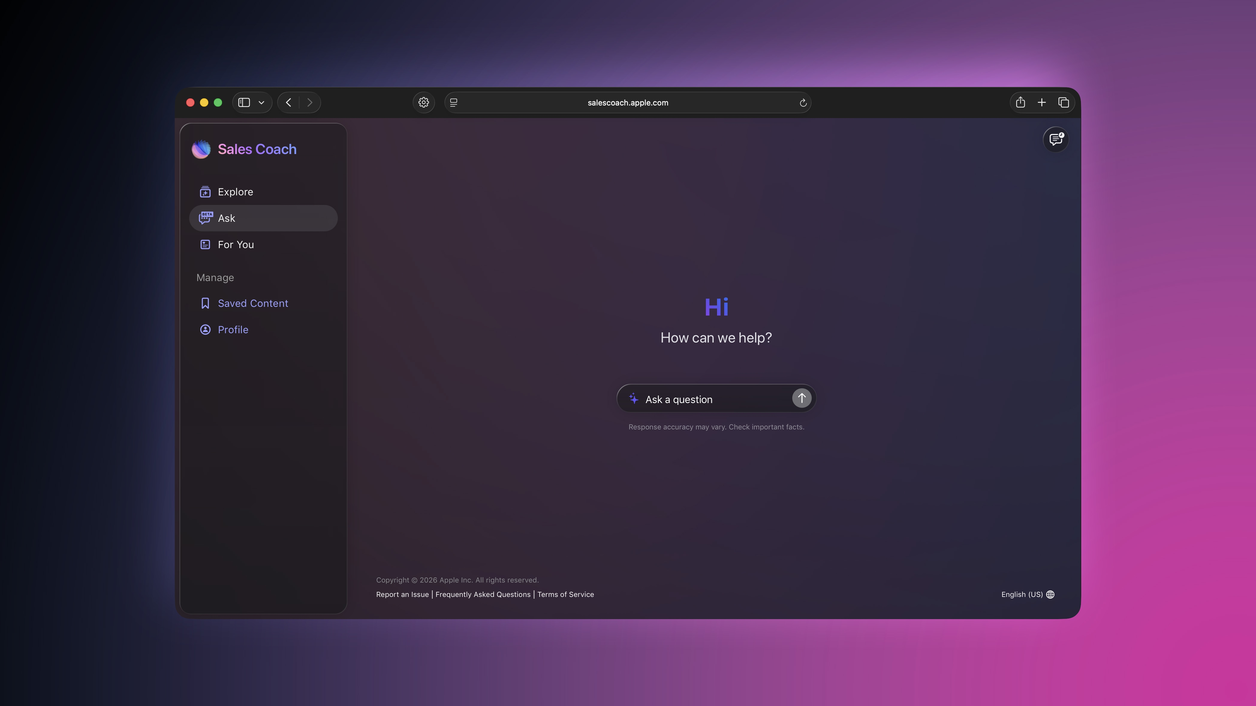 Apple Sales Coach uygulaması, tüketicilerden ziyade Apple mağaza çalışanları için tasarlanmış. Program, çalışanlara ürün açıklama teknikleri, müşteri hizmetleri yöntemleri ve satış etkileşimini geliştirme tekniklerini öğreten eğitim modülleri sunuyor. Uygulama, kullanıcıların chatbot sistemi aracılığıyla ürün ve hizmet soruları sormasına ve Apple ürünleri, hizmetleri ve satış stratejileri hakkında anında yanıtlar almasına olanak tanıyan modern bir arayüze sahip. Amaç, mağaza çalışanlarının günlük çalışmalarında bilgi ve koçluk araçlarına daha hızlı erişmelerini sağlamak.