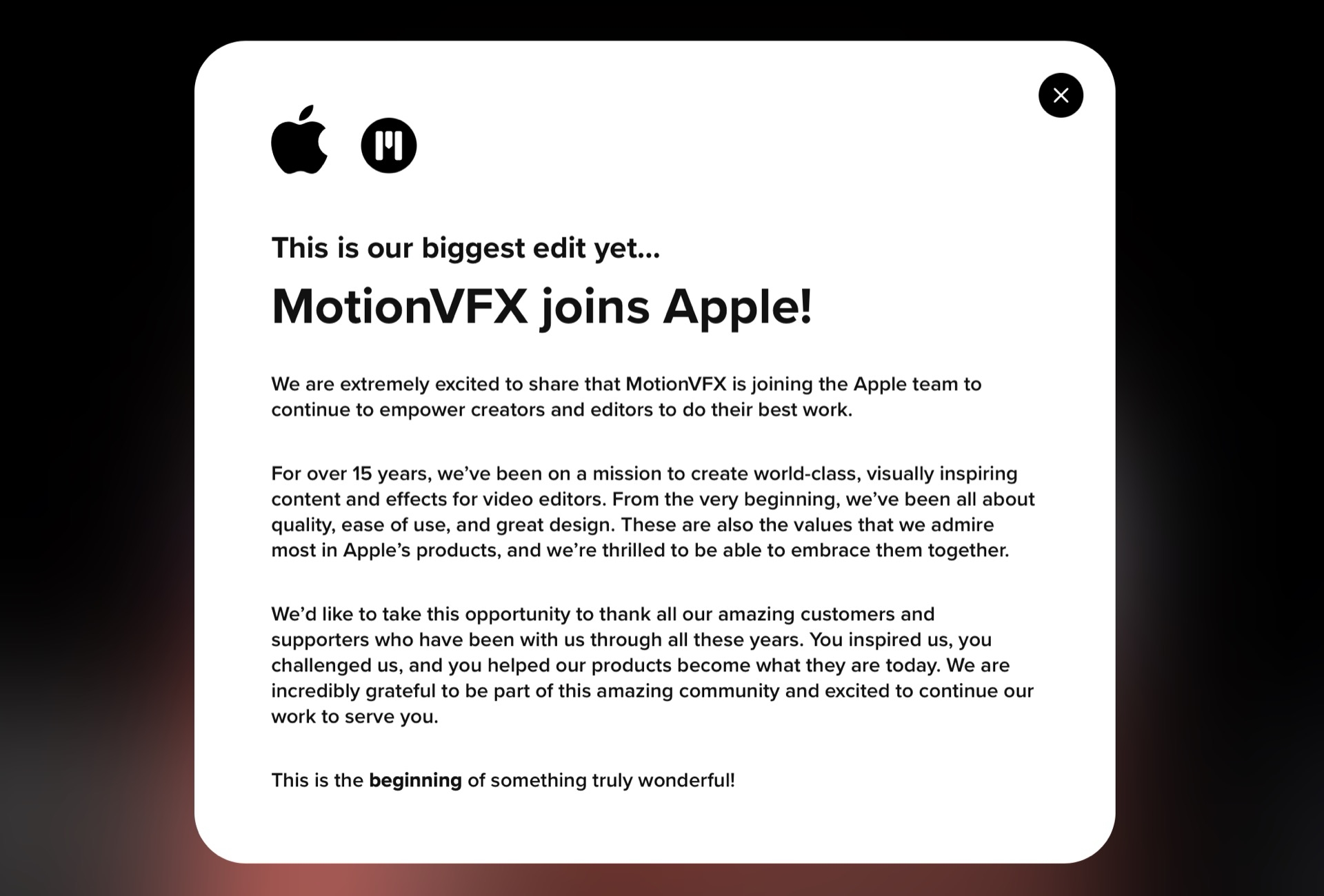 Apple, satın alıma ilişkin olarak resmi bir duyuru yapmazken, MotionVFX, web sitesi üzerinden şu açıklamayı yaptı: “İçerik üreticilerini ve editörleri en iyi işleri çıkarmaları için güçlendirmeye devam etmek üzere MotionVFX’in Apple ekibine katıldığını paylaşmaktan heyecan duyuyoruz. 15 yılı aşkın süredir, video editörleri için birinci sınıf, görsel olarak ilham verici içerik ve efektler yaratma misyonunu sürdürüyoruz. Başından beri kalite, kullanım kolaylığı ve harika tasarıma önem verdik. Bunlar aynı zamanda Apple ürünlerinde en çok hayran kaldığımız değerler ve bunları birlikte kucaklayabildiğimiz için çok heyecanlıyız.”