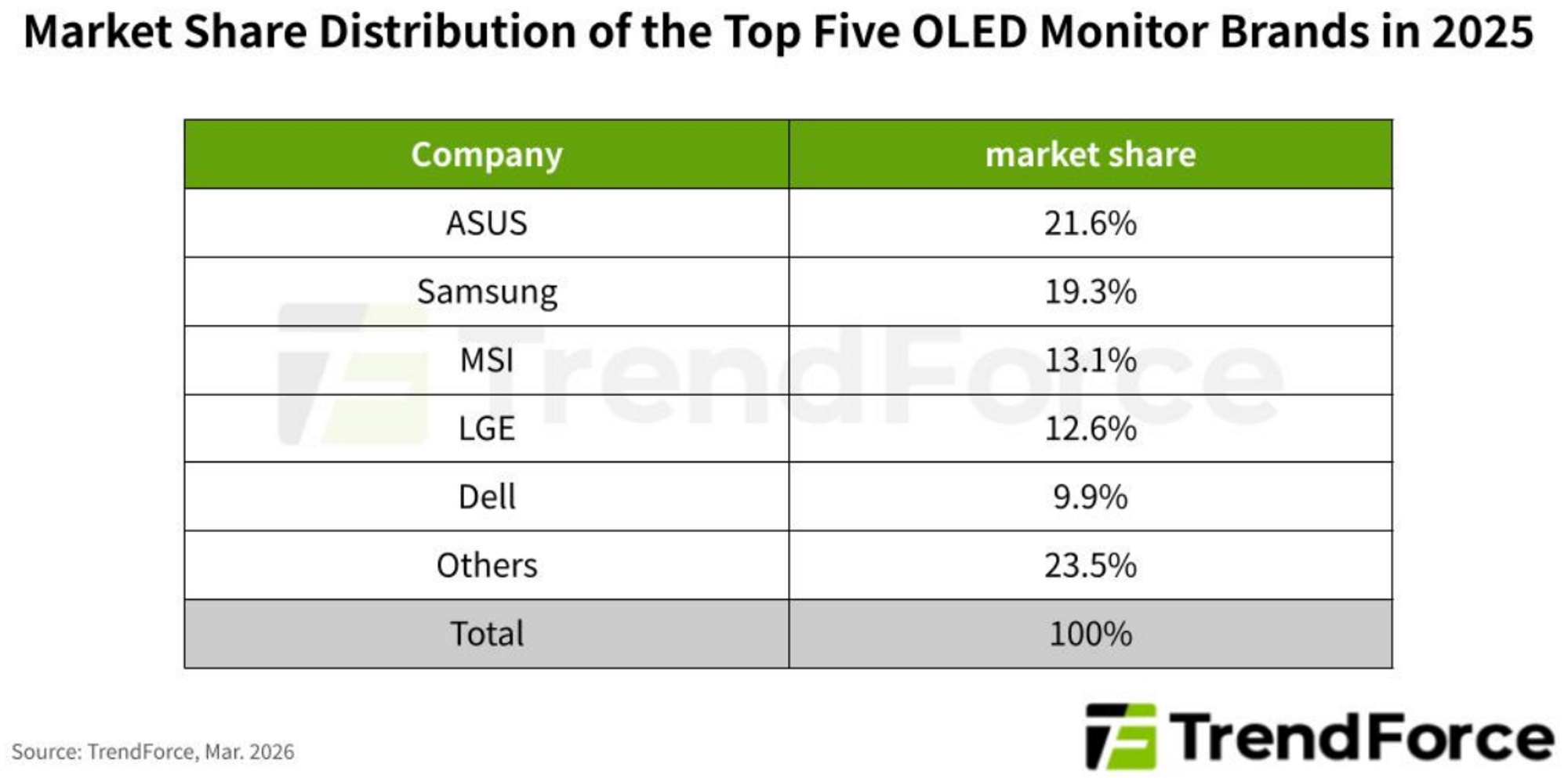 Trendforce verilerine göre OLED monitör pazarının en çok satan markaları arasında ilk sırayı Asus aldı. Şirket, yüzde 21.6 pazar payıyla ve ROG, ProArt ve ZenScreen serileriyle hem oyunculara hem de profesyonel kullanıcılara hitap eden geniş bir ürün yelpazesi sunuyor. İkinci sırada ise Samsung bulunuyor.